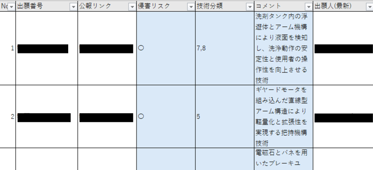 サンプルでは、皿洗いロボットの調査において「5.把持機構」「7.センサ技術」「8.洗浄技術」といった技術分類を付与してどのような技術に関する特許出願であるかを一目で判断できるようにしています。どのような技術分類を付与するかは個別にカスタマイズ可能です。